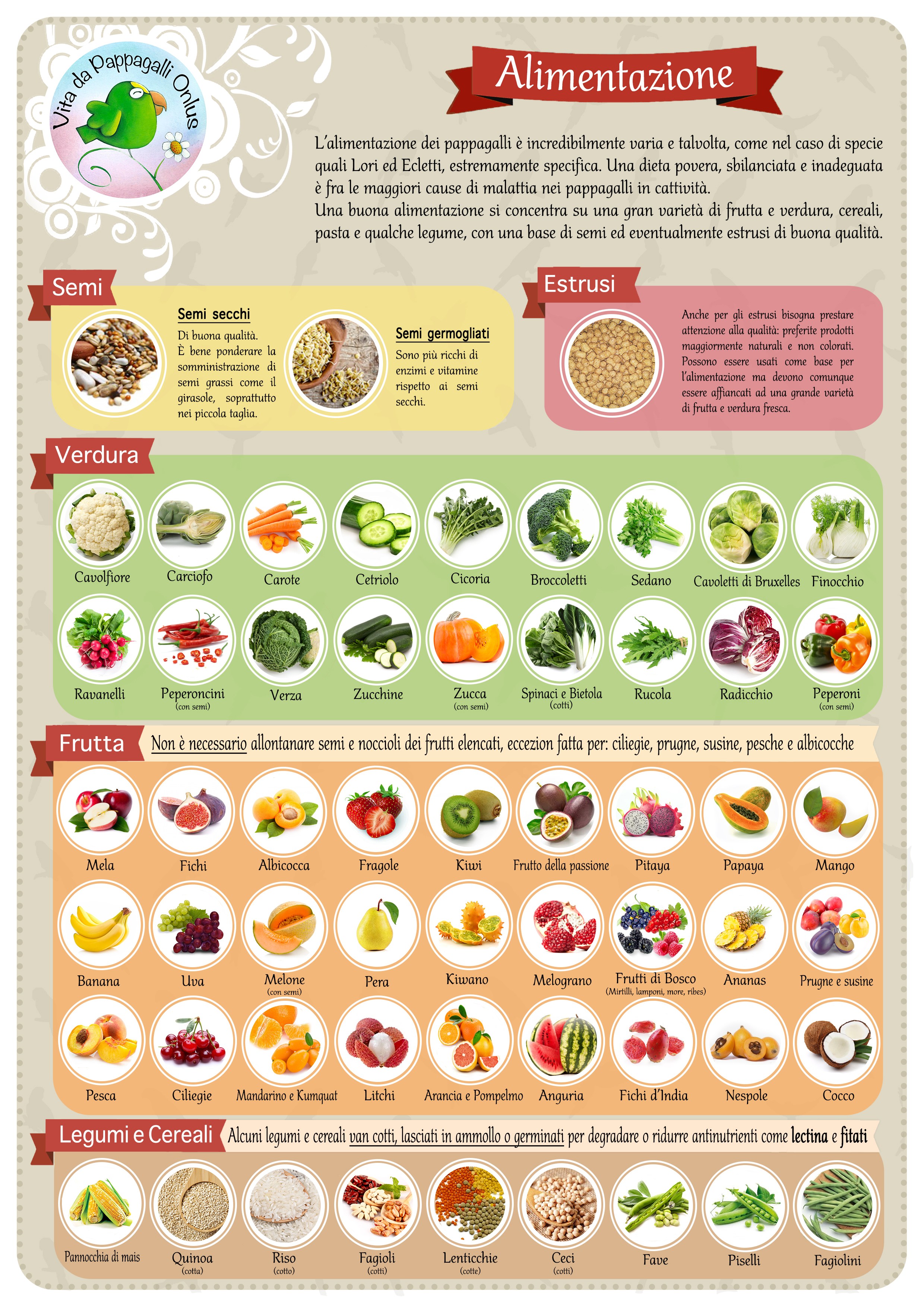 Tuttavia, per il benessere sia fisico che psicologico dei pappagalli, una parte dell’alimentazione giornaliera dovrebbe sempre includere la stessa tipologia di alimenti per i quali si sono evoluti, e cioè frutta e verdure fresche, semi, e in misura minore, noci e semi grassi, in aggiunta a estrusi o pellettati, e a cereali e legumi cotti.